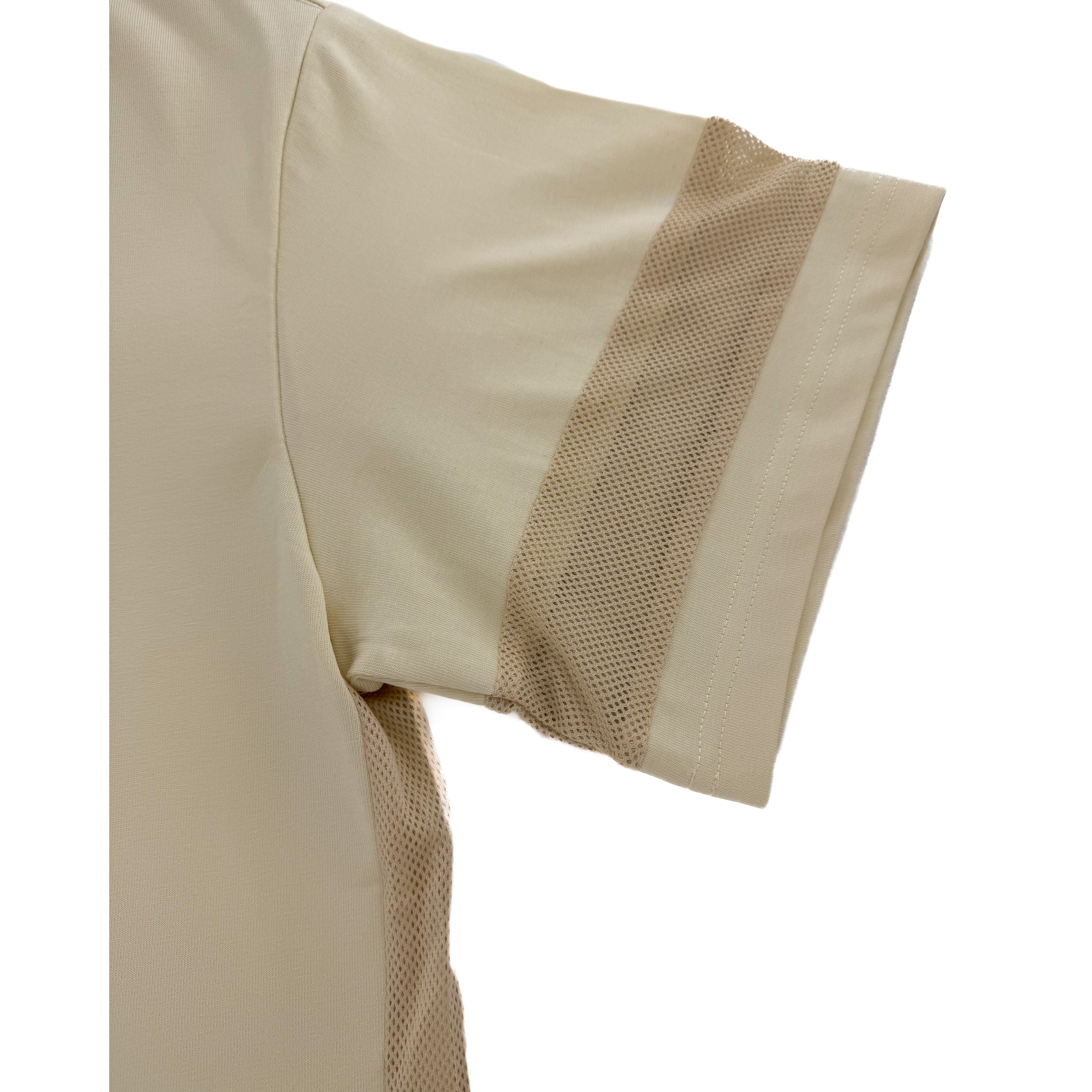 Constructed with integrated jersey panels along the sleeves and sides, the garment is engineered for breathability and movement. These panels also introduce a subtle two-tone dimension, designed to interact with layering—allowing an undershirt to become part of the visual language rather than something hidden.